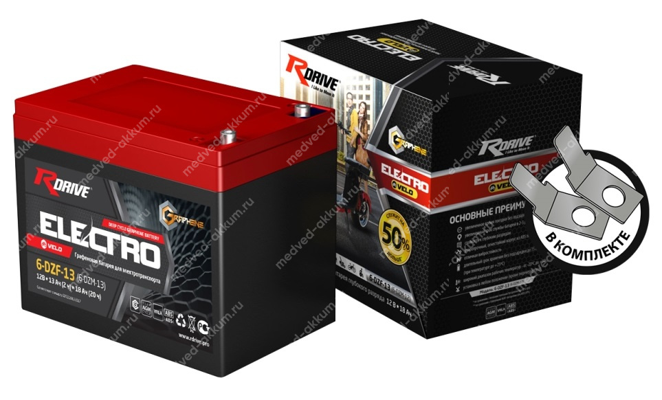 Серия RDrive ELECTRO VELO (GRAPHENE AGM) — усиленная версия тяговых батарей, разработанная в качестве источника питания для электротранспорта: велосипедов, мотоциклов, скутеров, трициклов и других устройств, оснащенных электрическим приводом. Произведенные по технологиям Graphene и AGM, аккумуляторы RDrive Electro Velo GRAPHENE - это необслуживаемые, герметизированные свинцово-кислотные батареи с абсорбированным в сепараторе из стекловолокна электролитом и системой рекомбинации газов (VRLA). Графеновая добавка значительно увеличивает производительность и срок службы аккумуляторной батареи, а также снижает расход воды. Все батареи RDrive ELECTRO Velo прошли полный цикл испытаний на качество сборки и соответствие продукции заявленным характеристикам. Система менеджмента качества производителя сертифицирована по международным стандартам ISO 9001 и ISO 14001. Продукция серии ELECTRO Velo полностью соответствует требованиям стандарта GB/T 22199.2-2017, разработанного специально для герметизированных свинцов