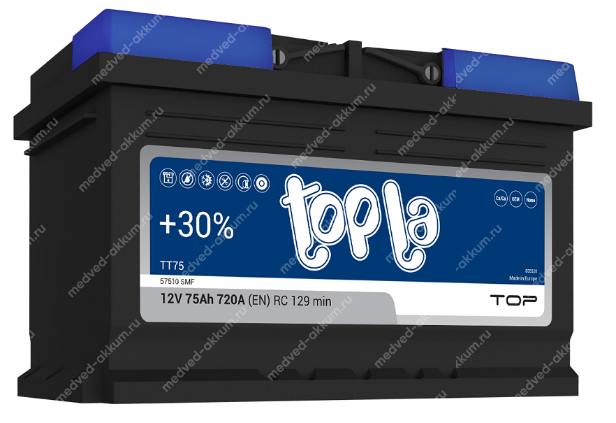 В батареях серии TOPLA TOP используется новейшая технология производства Са/Са батарей, которая обеспечивает наибольшую отдачу при холодном пуске двигателя и высокую мощность, необходимую для современного поколения автомобилей с повышенным энергопотреблением. Применение SMF-крышки дает полную защиту от выливания электролита даже при переворачивании батареи и исключает необходимость технического обслуживания в течение всего срока службы батареи. Отличительные особенности: • Конструкция с герметичной крышкой Sealed Maintenance-Free (SMF) • Батарея наивысшего качества • Большее число пластин гарантирует на 30% больший пусковой ток • Использование просечной-растяжной технологии позволяет достичь лучшей коррозийной защиты и продлевает срок службы аккумулятора • Индикатор уровня заряда (глазок Magic Eye) дает возможность быстрой проверки текущего состояния батареи • Устройство защиты от взрыва предотвращает попадание пламени в батарею • Идеально подходит для автомобилей с большим количеством электрооборудования
