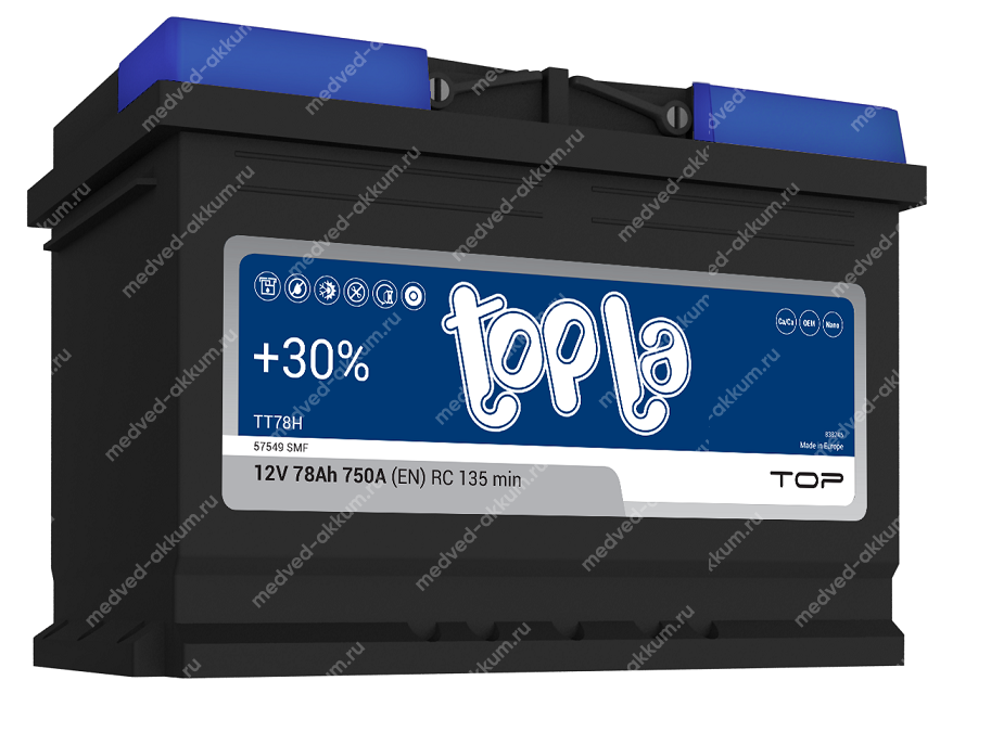 В батареях серии TOPLA TOP используется новейшая технология производства Са/Са батарей, которая обеспечивает наибольшую отдачу при холодном пуске двигателя и высокую мощность, необходимую для современного поколения автомобилей с повышенным энергопотреблением. Применение SMF-крышки дает полную защиту от выливания электролита даже при переворачивании батареи и исключает необходимость технического обслуживания в течение всего срока службы батареи. Отличительные особенности: • Конструкция с герметичной крышкой Sealed Maintenance-Free (SMF) • Батарея наивысшего качества • Большее число пластин гарантирует на 30% больший пусковой ток • Использование просечной-растяжной технологии позволяет достичь лучшей коррозийной защиты и продлевает срок службы аккумулятора • Индикатор уровня заряда (глазок Magic Eye) дает возможность быстрой проверки текущего состояния батареи • Устройство защиты от взрыва предотвращает попадание пламени в батарею • Идеально подходит для автомобилей с большим количеством электрооборудования